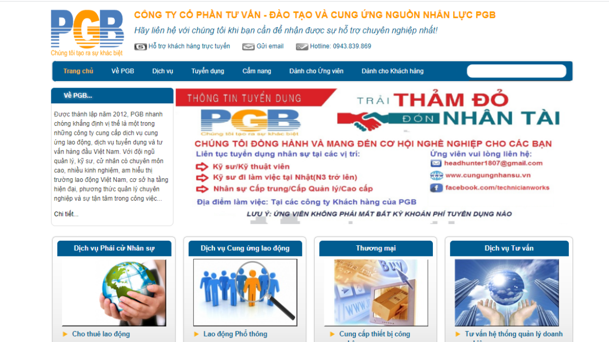 PGB là đơn vị cung cấp dịch vụ tuyển dụng và cung ứng nhân sự hàng đầu tại Việt Nam. PGB đã và đang mang lại những giải pháp chất lượng giúp các doanh nghiệp/tổ chức phát triển một cách bền vững. Ngoài ra, nơi đây còn kinh doanh thiết bị công nghệ thông tin, máy văn phòng, văn phòng phẩm.