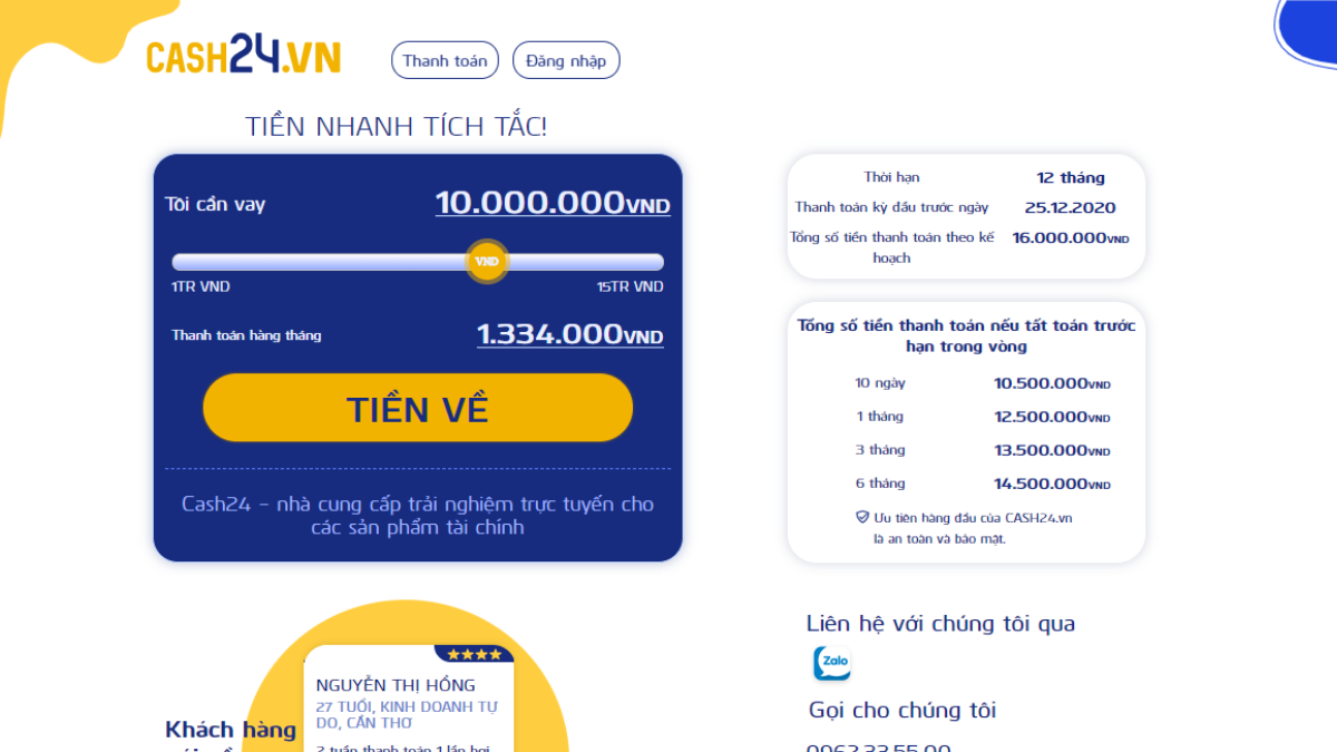 VayVNĐ là nhà cung cấp dịch vụ tư vấn giải pháp tài chính và cung cấp giải pháp tiền mặt trực tuyến. Mỗi ngày, với sự giúp đỡ của chúng tôi, rất nhiều người trên cả nước đã giải quyết được các vấn đề tài chính khẩn cấp của mình với thủ tục đang ký đơn giản. Nhiệm vụ của chúng tôi là trở thành một đối tác đáng tin cậy bằng cách cung cấp các giải pháp tài chính với điều khoản thuận lợi nhất cho những người vướng vào Hoàn Cảnh khó khăn về tài chính, làm cho thị trường cho vay ở Việt Nam trở nên vô cùng minh bạch, đơn giản với điều kiện phù hợp nhất đối với từng đối tượng khách hàng.