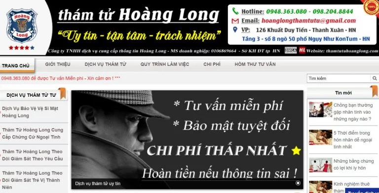 Nói đến top 10 công ty thám tử uy tín nhất tại Hà Nội phải kể đến công ty thám tử tư Hoàng Long – một trong những công ty thám tử tư hàng đầu tại Việt Nam. Với những chuyên gia hàng đầu, chiến lược đúng đắn, cùng với đội ngũ thám tử trẻ trung nhiệt huyết, công ty đã làm hài lòng rất nhiều khách hàng tìm đến dịch vụ của công ty. Muốn tìm chân tướng sự thật, hãy tìm đến Thám tử Hoàng Long để được phục vụ bằng sự chân thành, bằng những kinh nghiệm và nghiệp vụ đỉnh cao.