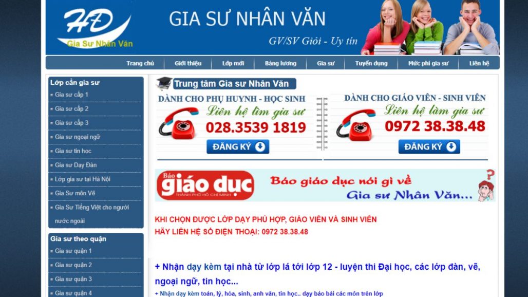 Trung tâm gia sư Nhân Văn hiện là một trong những trung tâm gia sư uy tín nhất tại Thành phố Hồ Chí Minh trong việc dạy kèm, hỗ trợ nâng cao kiến thức từ cơ bản cho đến nâng cao các cấp bậc 1, 2, 3 và các khối đại học chuyên sâu A, B, C, D,… Không chỉ có thể chủ động đưa ra yêu cầu về giáo viên giảng dạy như giới tính, trình độ, chuyên môn, giọng nói địa phương,…mà khi lựa chọn tìm kiếm gia sư tại Trung tâm gia sư Nhân Văn còn được trực tiếp dự giảng trong 2 buổi đầu giáo viên nhận lớp để nắm bắt được chính xác chất lượng học tập của con em mình.